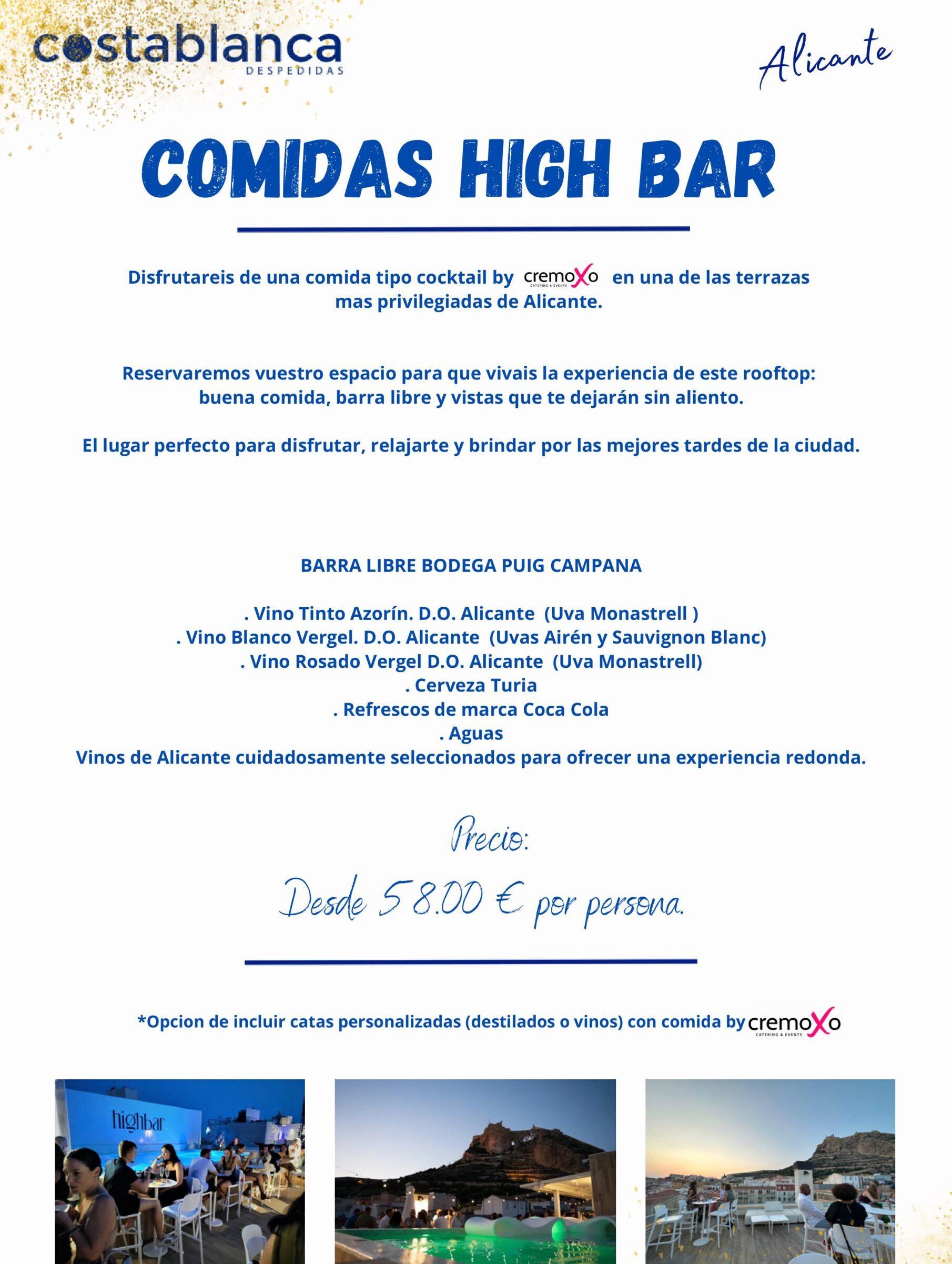 En High Bar, cada elemento está diseñado para que la experiencia sea completa. La gastronomía sorprende, la barra libre acompaña y potencia los sabores, y las vistas de Alicante ofrecen un marco incomparable para cualquier celebración. Todo esto se combina con un ambiente cuidado, elegante y relajado, que permite que los asistentes se sientan cómodos y disfruten de cada momento.